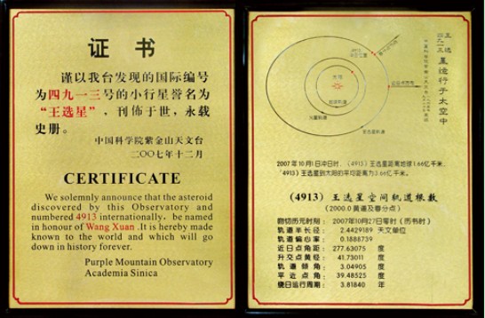 2008年1月31日,經國際小行星中心和國際小行星命名委員會批準,國際編號為4913號小行星,正式命名為“王選星”。